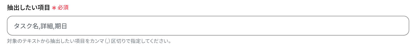 「抽出したい項目」 :対象のテキストから抽出したい項目をカンマで区切り、設定してください。
