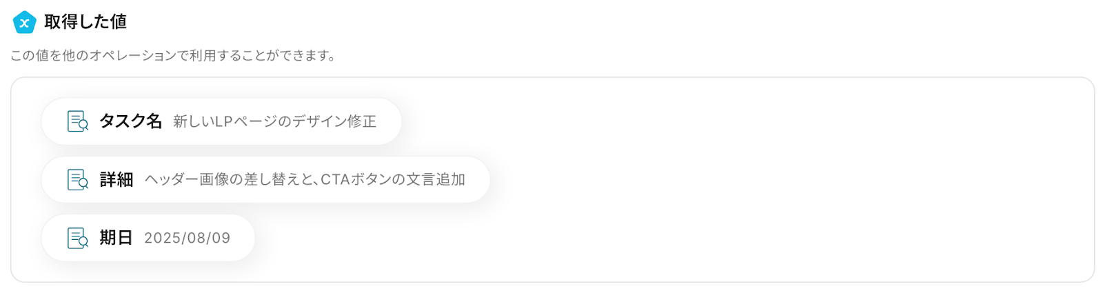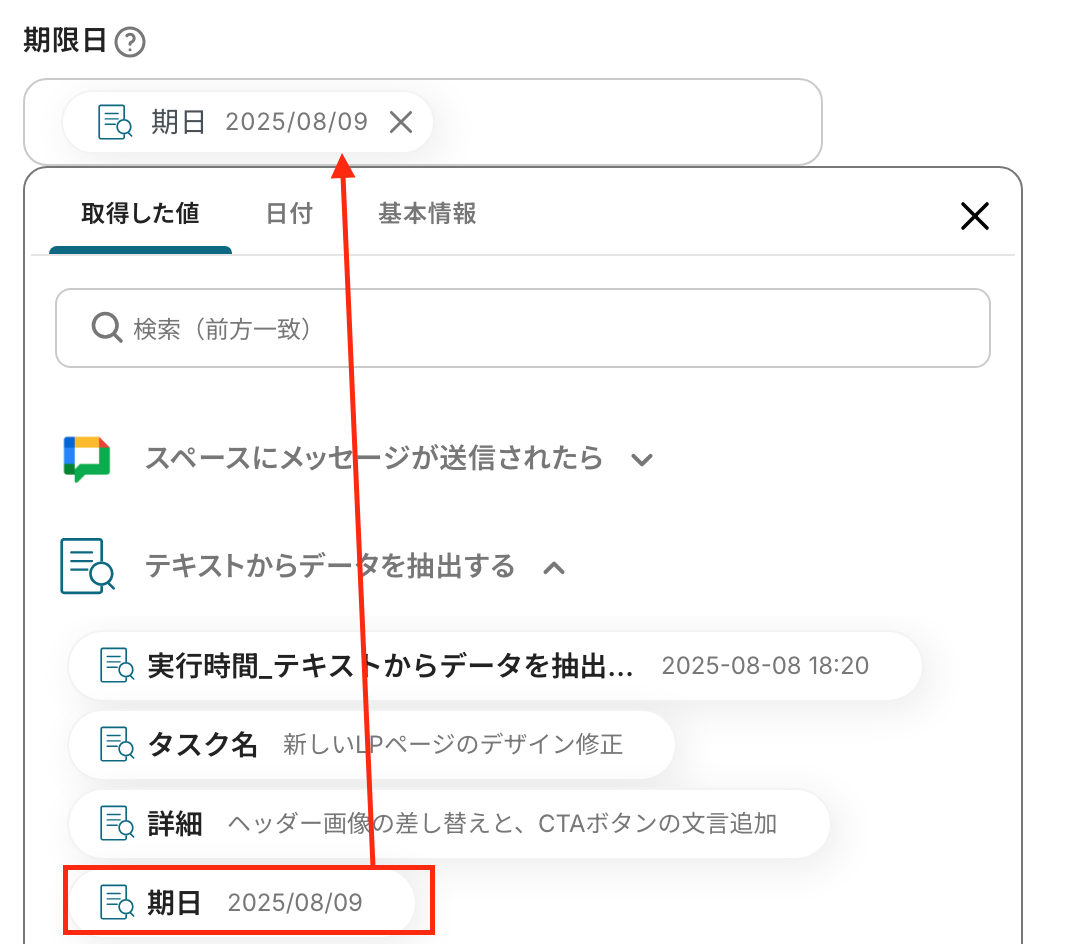 「期限日」 :任意で設定してください。こちらもアウトプットを引用した設定が可能です。