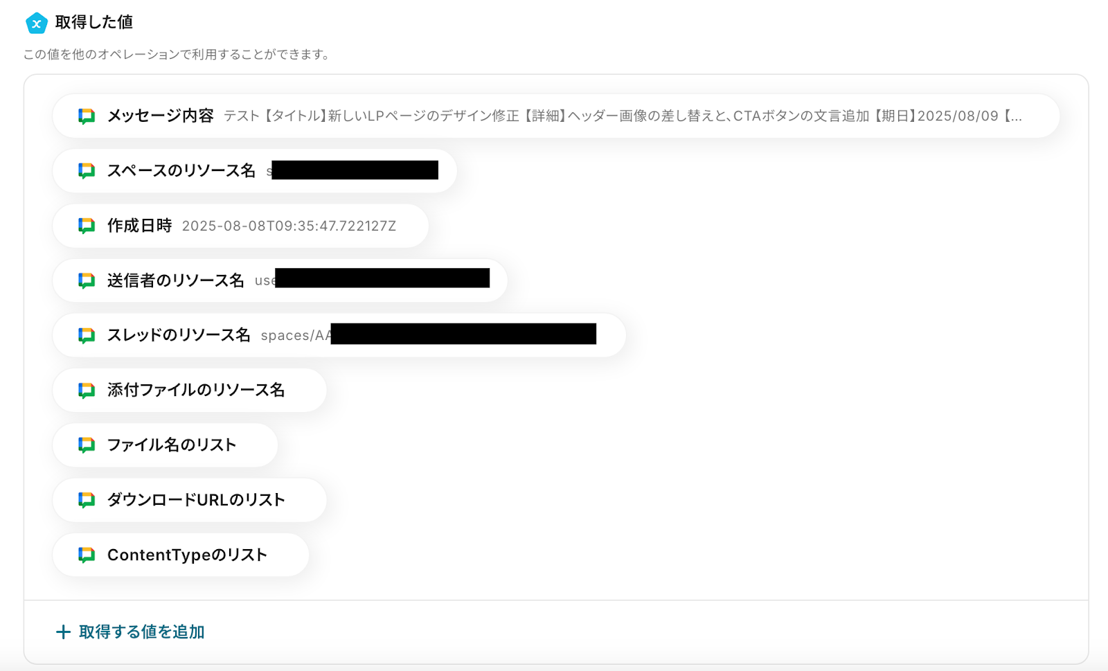 テストをする前に、Google Chatにメッセージをテスト投稿してください。 完了後、「テスト」をクリックしてください! テストが成功すると、アウトプット (取得した値)が表示されます。 ※表示されているアウトプットは、次の設定で活用します。