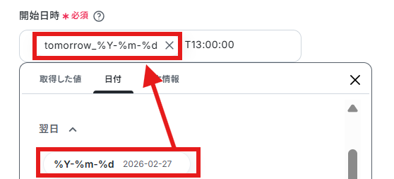 開始日時は画面注釈を参考に、「日付」の項目を使って以下のように入力しました。