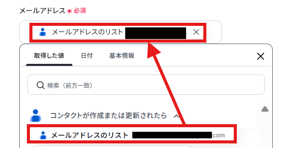 メールアドレスは取得した値の「メールアドレスのリスト」を入力します。
