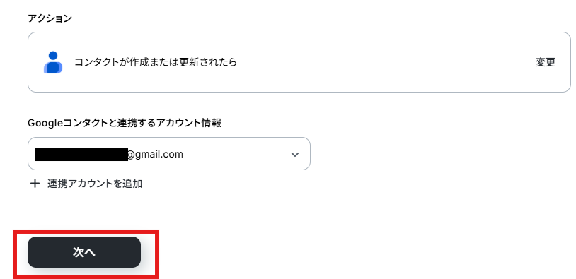 アクションはデフォルト設定のまま、アカウント情報は、連携したいアカウントが選択されているか確認してください。確認が終わったら「次へ」で進みましょう。