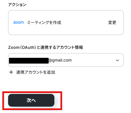 アクションはデフォルト設定のまま、アカウント情報は、連携したいアカウントが選択されているか確認してください。確認出来たら「次へ」をクリックしましょう。