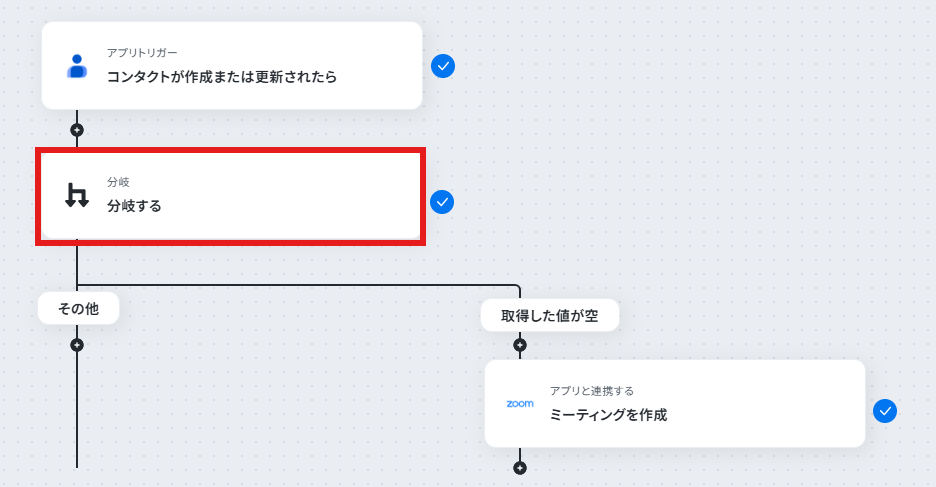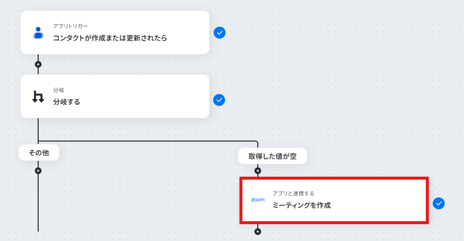 Googleコンタクトのトリガーは、フローボットが起動する間隔を任意で設定することが可能です。 分岐機能では、Googleコンタクトから取得した情報(氏名、会社名、ラベルなど)を基に、ミーティングを作成する条件を自由にカスタマイズできます。 Zoomでミーティングを作成する際、トピック名や議題、開始時間などをGoogleコンタクトの情報を引用して動的に設定することが可能です。 ■注意事項