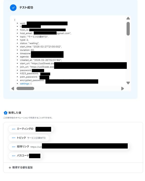 Zoomのミーティング作成アクションでは、会議のトピック(件名)や説明文に、kintoneから取得した顧客名や案件名といった情報を動的に割り当てることが可能です。 ミーティングの開始時刻や所要時間も、kintoneのフィールド情報を基に設定するか、あるいは固定の値を指定するかなど、運用に合わせて柔軟にカスタマイズできます。 ■注意事項