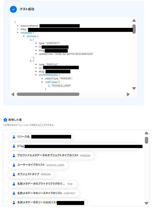 ここまで終わったらテストボタンをクリックしましょう。 テストが成功し取得した値が入ります。※取得した値とは? 取得した値とは、トリガーやオペレーション設定時に、「テスト」を実行して取得した値のことを指します。 取得した値は、後続のオペレーション設定時の値として利用でき、フローボットを起動する度に、変動した値となります。詳しくは以下をご覧ください。