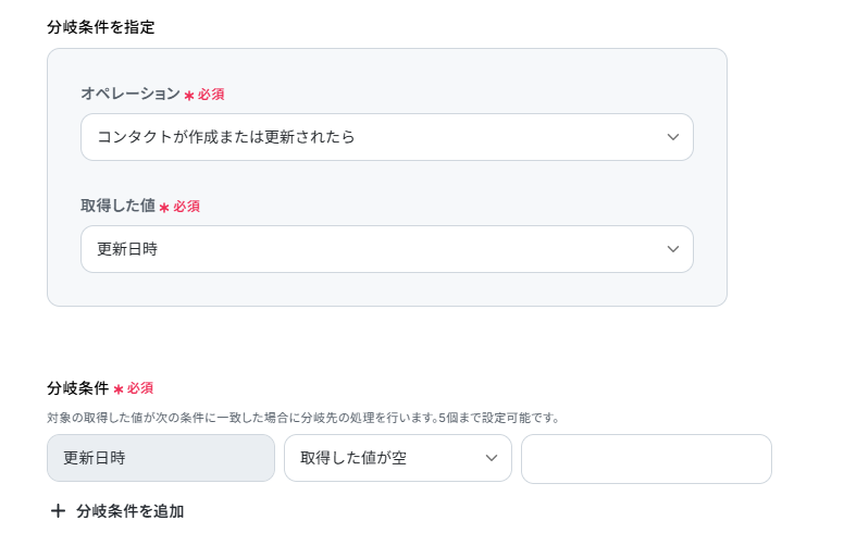 今回のトリガーは「コンタクトが作成または更新されたら」ですが、その後の分岐設定で新規作成時のみ反応するように設定をしているため、コンタクトが新規で作成された場合のみ起動します。 更新された場合もフローを起動させたい場合は分岐設定を削除してください。
