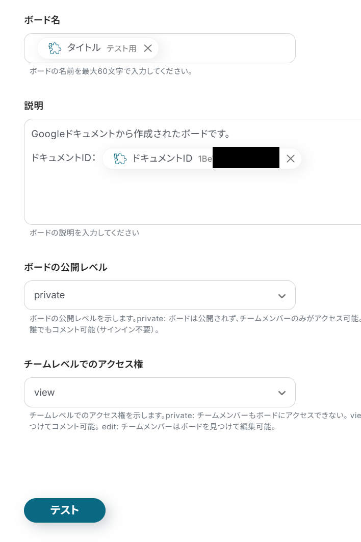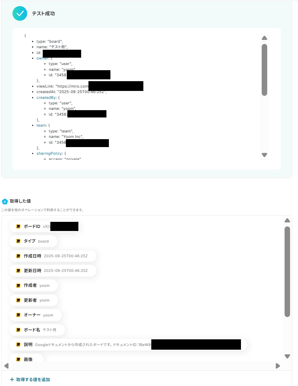前項で取得した値から、Miroのボードを作成する設定を行います。