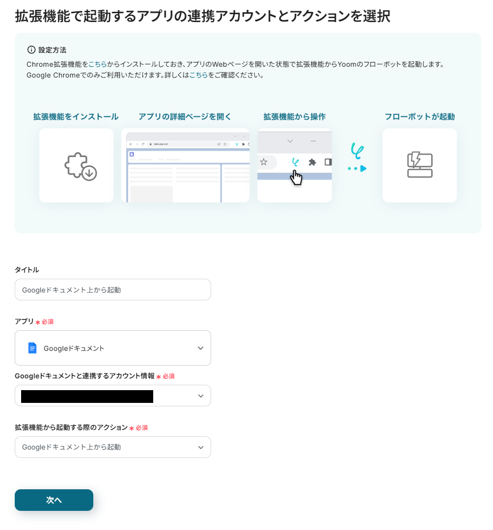 拡張機能をインストールしたら、以下の項目がすでに設定されているため「次へ」をクリックして進みましょう。