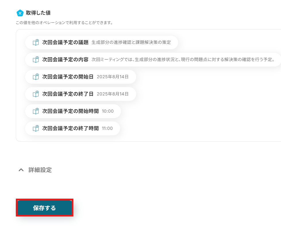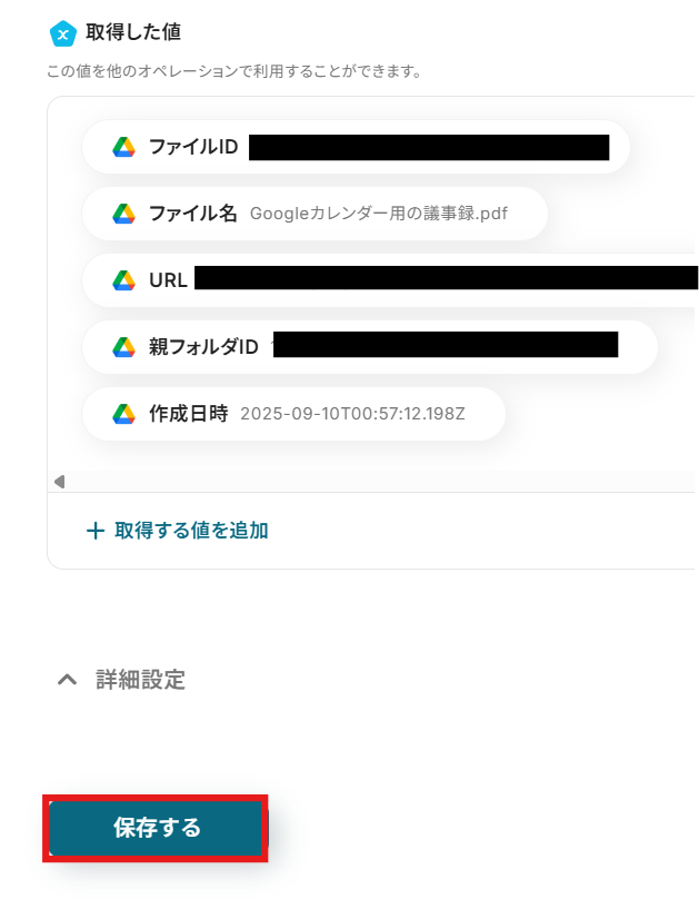 テストが成功したら、アウトプットが取得されます。 設定を保存し、アプリトリガーの設定完了です! ※アウトプットについての詳細は、こちら をご確認ください。