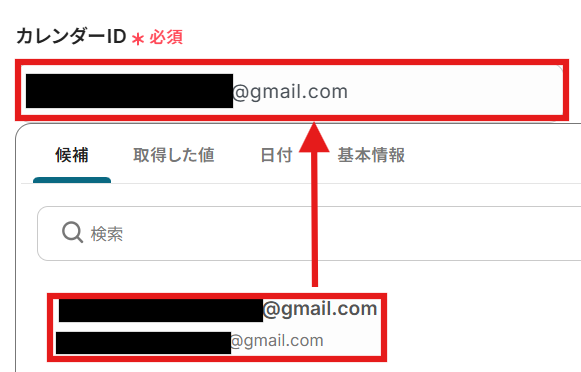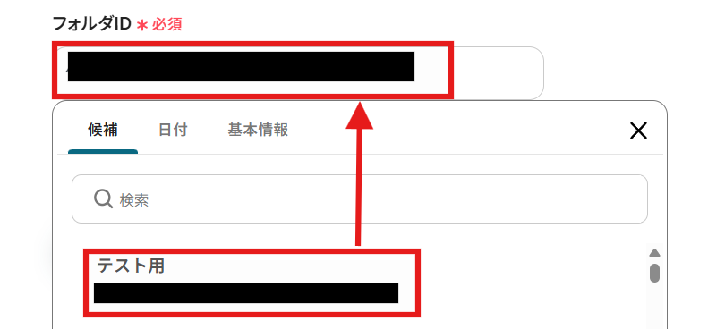 「フォルダID」は入力欄をクリックすると候補が表示されますので、テストで使用するフォルダを選択してください。