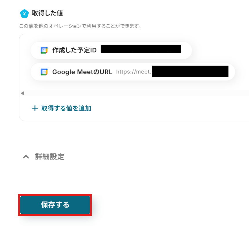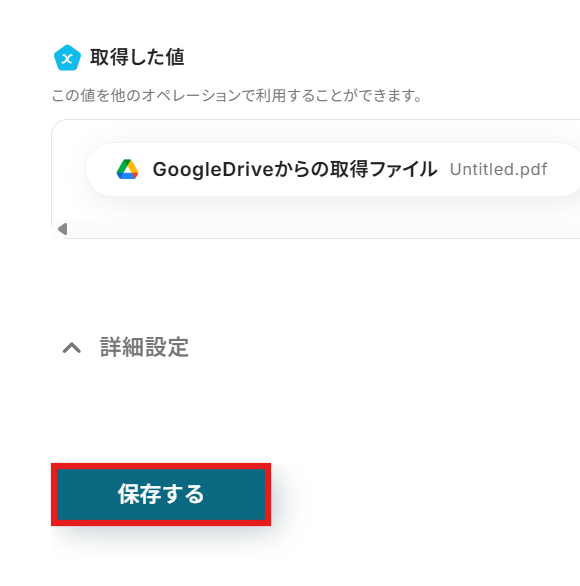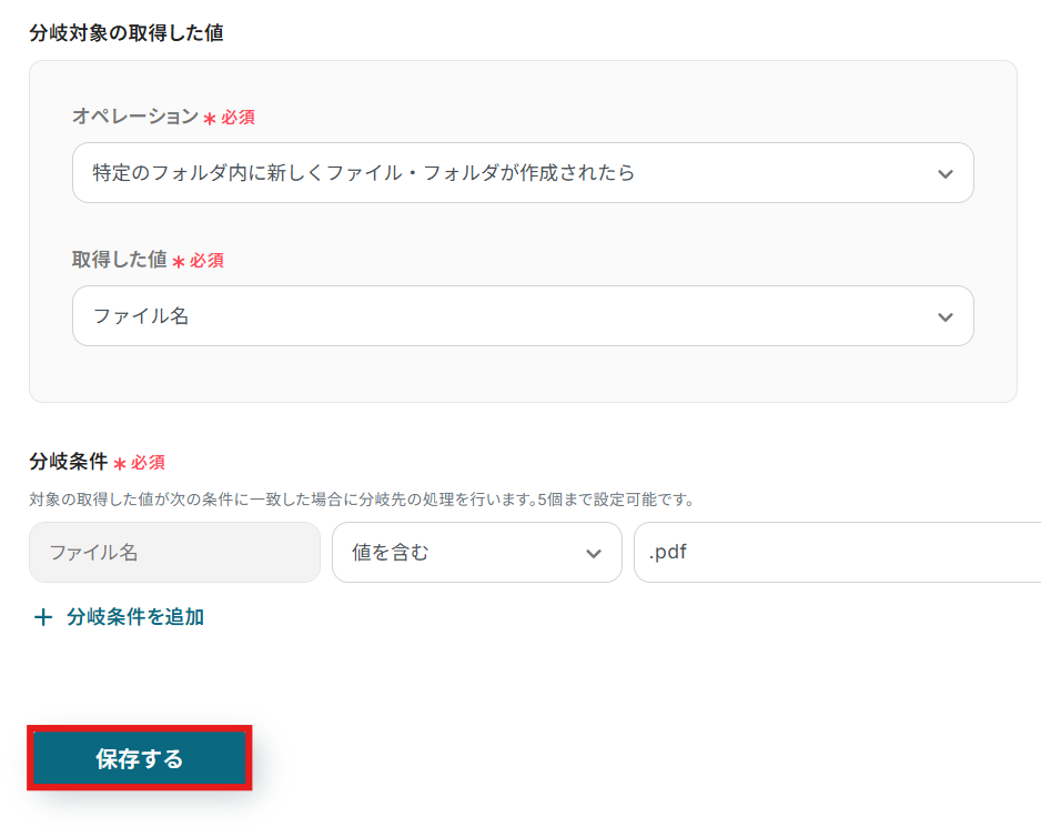 「オペレーション」「取得した値」と「分岐条件」をそれぞれ選択し、「保存する」をクリックします。