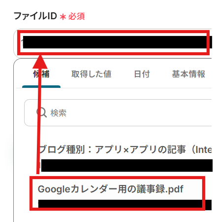 「ファイルID」の入力欄をクリックすると選択肢が表示されるので、候補から選択しましょう。