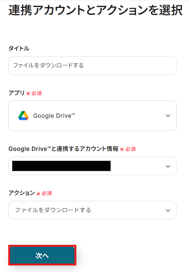 タイトルは任意でわかりやすいものを設定しましょう。 アカウント情報は、マイアプリ連携の際に設定したものになっているか確認してください。 アクションはデフォルトで入力されている状態のままで進めます。