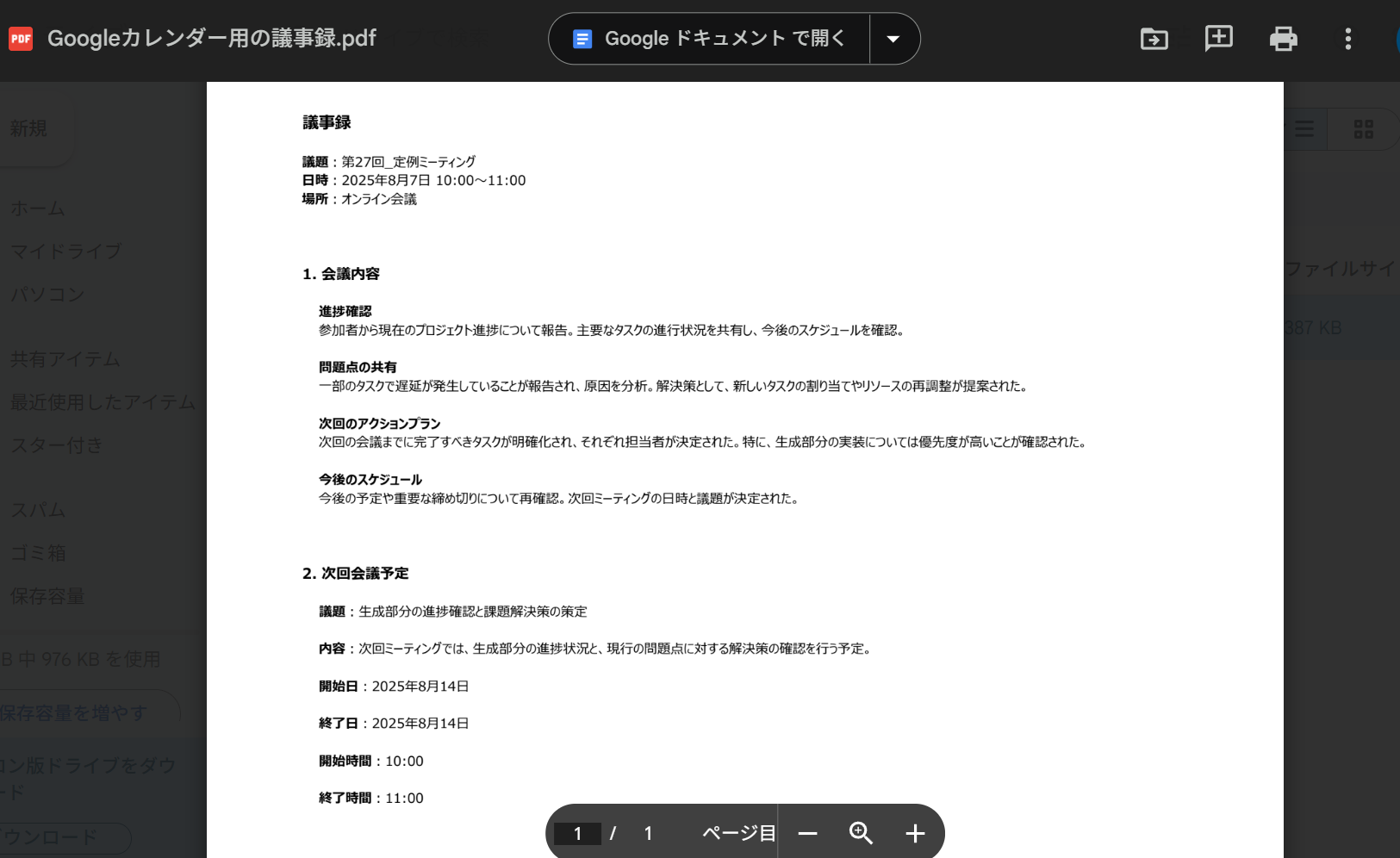 Google Driveにアップロードされたファイルの内容をAIが読み取り、その要約や概要を生成した上で、Googleカレンダーに予定を作成する自動化フローです。例えば、長文の報告書や議事録がアップロードされた際に、AIが作成した要点を予定の詳細欄に自動で記載できる ため、関係者はすぐに内容を把握でき、迅速な意思決定に繋がります。この連携は、AIによる情報生成といった高度なデータ加工処理を含んでいます。