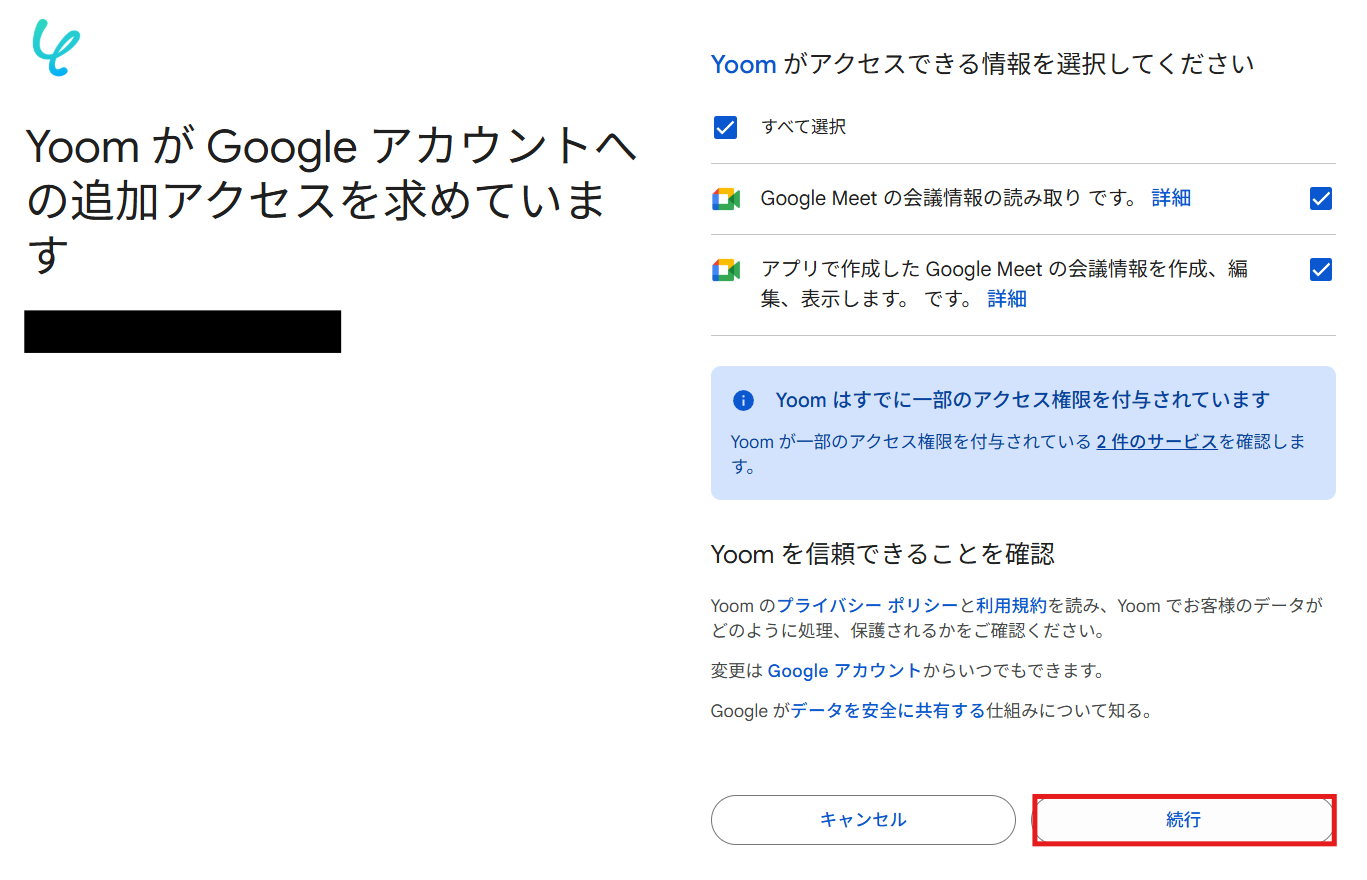 追加アクセスの選択が表示されるので、問題なければ「続行」をクリックして先に進みます。