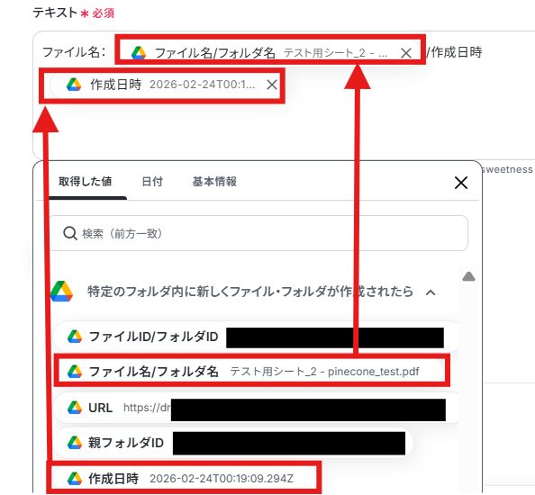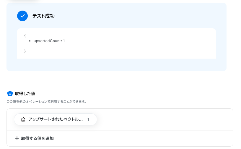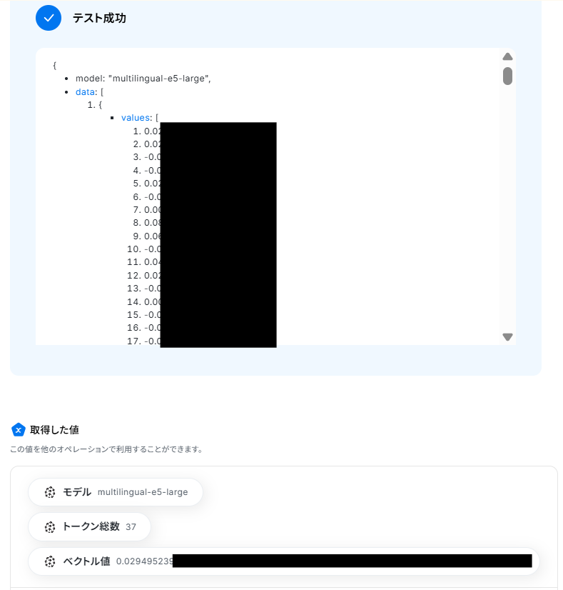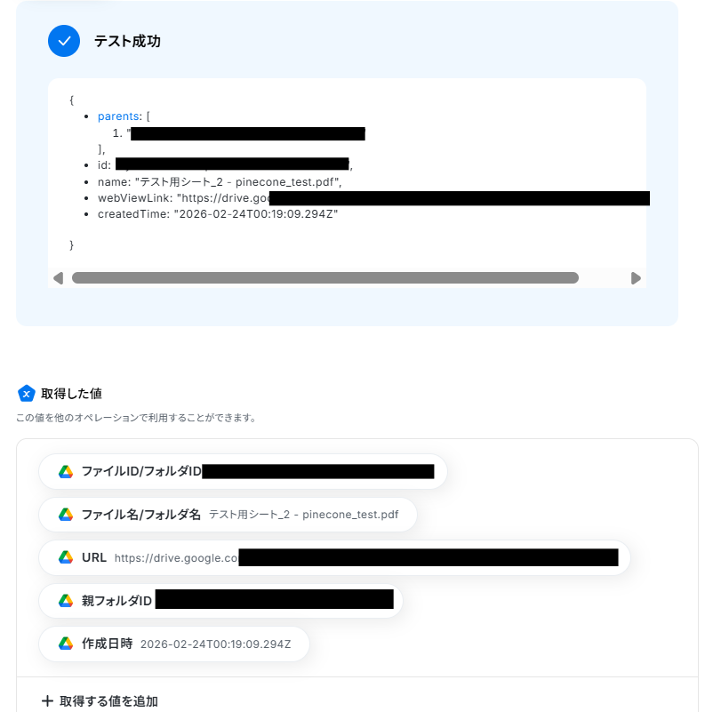 入力ができたら「テスト」ボタンを押してみましょう。連携が成功すると以下のように取得した値が入ります。