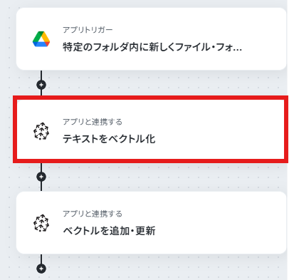 はじめに、Google DriveとPineconeをYoomに連携します。 次に、トリガーとしてGoogle Driveを選択し、「特定のフォルダ内に新しくファイル・フォルダが作成されたら」を設定します。 続いて、オペレーションでPineconeの「テキストをベクトル化」アクションを設定し、Google Driveから取得したファイルの概要をベクトルデータに変換します。 最後に、オペレーションでPineconeの「ベクトルを追加・更新」アクションを設定し、ベクトル化されたデータをPineconeに追加します。 ※「トリガー」:フロー起動のきっかけとなるアクション、「オペレーション」:トリガー起動後、フロー内で処理を行うアクション