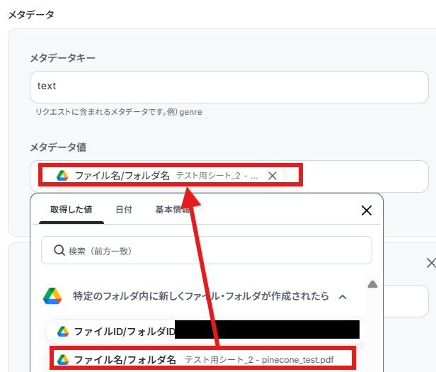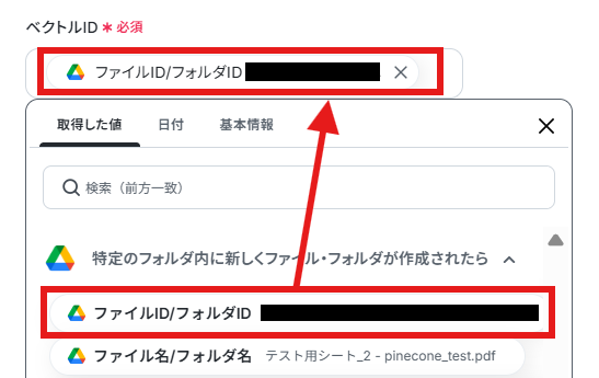 Google Driveのトリガー設定では、自動化の監視対象としたいフォルダを任意で指定してください。 Pineconeに追加するベクトルデータに、Google Driveのファイル名や作成日といった情報をメタデータとして紐付けることが可能です。 Pineconeのオペレーションでは、ベクトルを追加する対象のインデックスホストを任意に設定できます。 ■注意事項