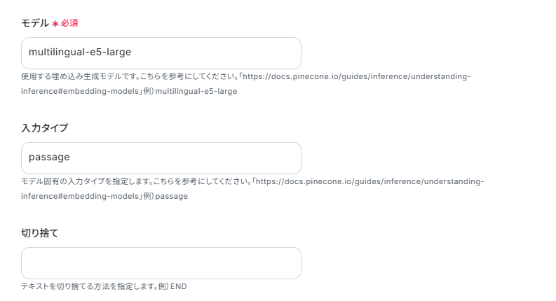 Pineconeの「テキストをベクトル化」アクションでは、ベクトル化の対象とするShopifyの商品情報(商品名、商品説明、タグなど)を任意で設定してください。 Pineconeでベクトルを追加・更新するアクションを設定する際に、対象となるインデックスホストを任意で設定してください。 ■注意事項