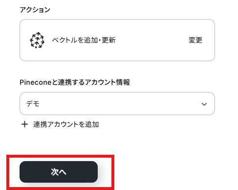HubSpotのトリガー設定では、自動化の対象としたいフォームを任意で選択できます。 Pineconeに連携するHubSpotのフォーム情報は、名前やメールアドレスなど、必要な項目を任意で設定可能です。 Pineconeでベクトルを追加・更新するアクションでは、対象のインデックスホストや紐付けるメタデータを任意で設定できます。 ■注意事項