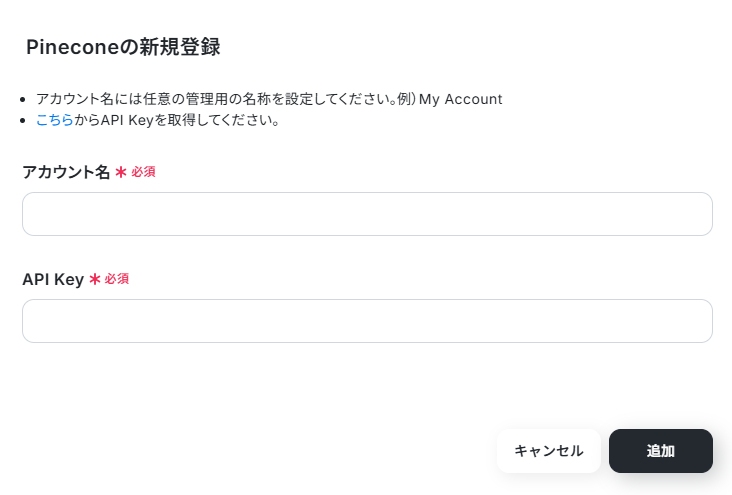 マイアプリ>新規接続からPineconeを検索し、画面注釈通りアカウント名を入れ、API Keyを取得し入力を行ってください。