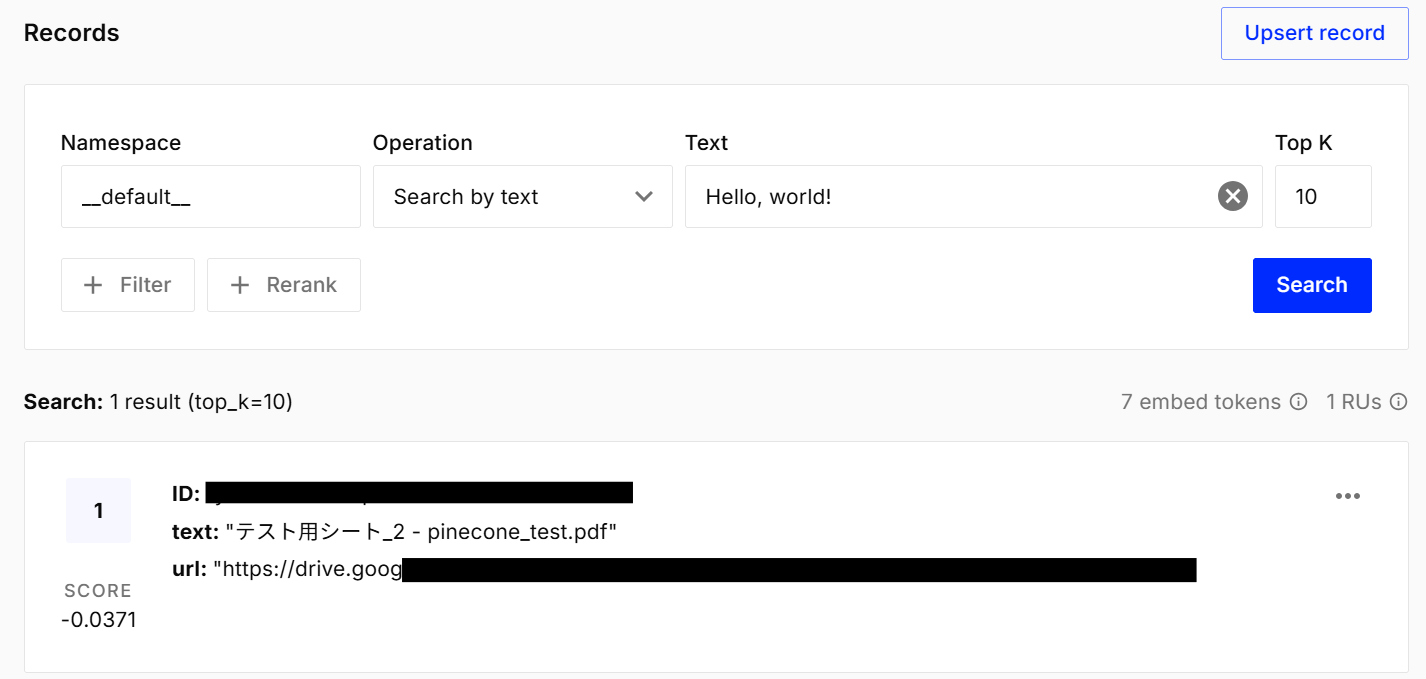 Pineconeを見に行くと、対象のインデックスに値が追加されています。
