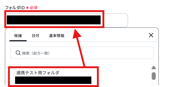 フォルダIDは上記ファイルを保存したフォルダを候補より入力していきます。