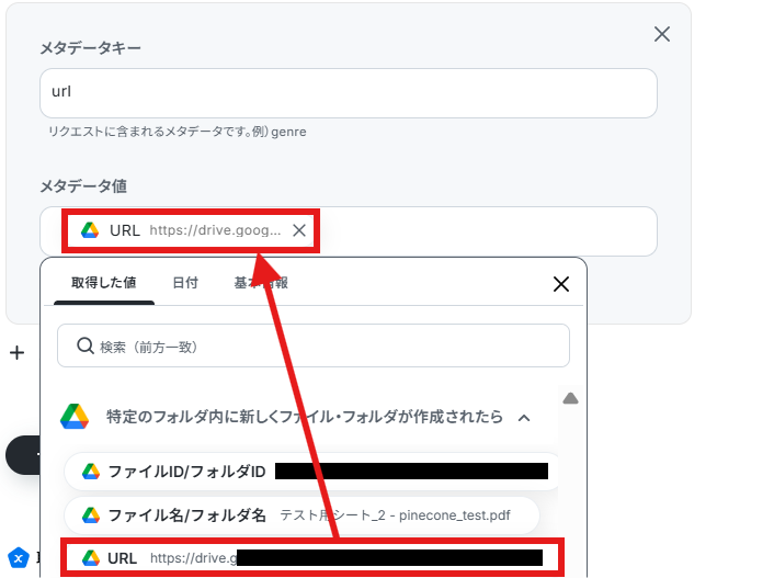メタデータはデフォルトで値が入っているので、変更していません。 対応するものを取得した値から選択します。