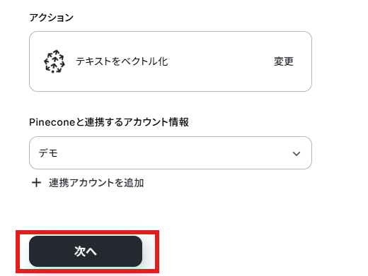 ステップ4:Pineconeでテキストをベクトル化する 次に、Pineconeでテキストをベクトル化します。「テキストをベクトル化」をクリックしてください。