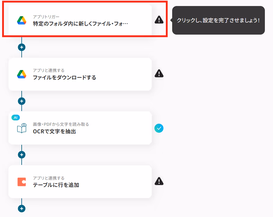 特定のファイル名や形式(例:「請求書」という単語を含むPDFファイルなど)を持つファイルがGoogle Driveに格納された場合のみ、OCRで内容を読み取りCodaに行を追加する、といった条件付きの自動化も可能です。