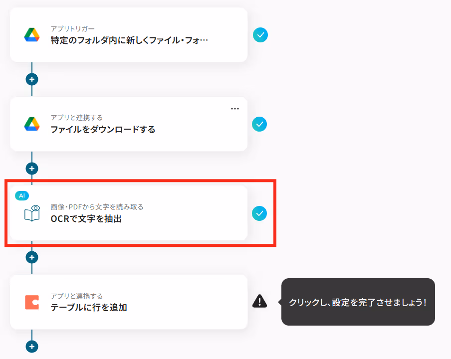 「取得した値」は変数となるので、Google Driveで特定のフォルダ内に新しくファイルが作成され、OCRで文字が抽出される度にそのデータを活用可能になります!