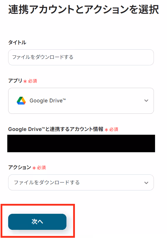 タイトルと連携するアカウント情報を確認し、アクションはテンプレート通りのまま「次へ」をクリックして進んでください。