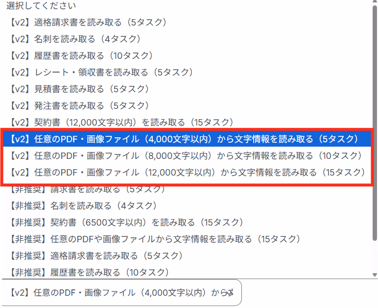 デフォルトでは「任意のPDF・画像ファイル(4,000文字以内)から文字情報を読み取る(5タスク)」が設定されていますが、任意のアクションを選択可能です。