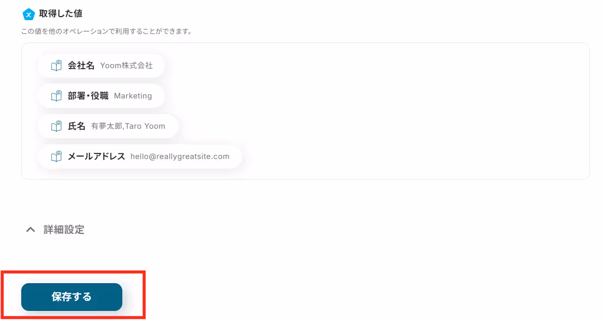 今回は例として、「会社名,部署・役職,氏名,メールアドレス」を抽出できるように設定しました!