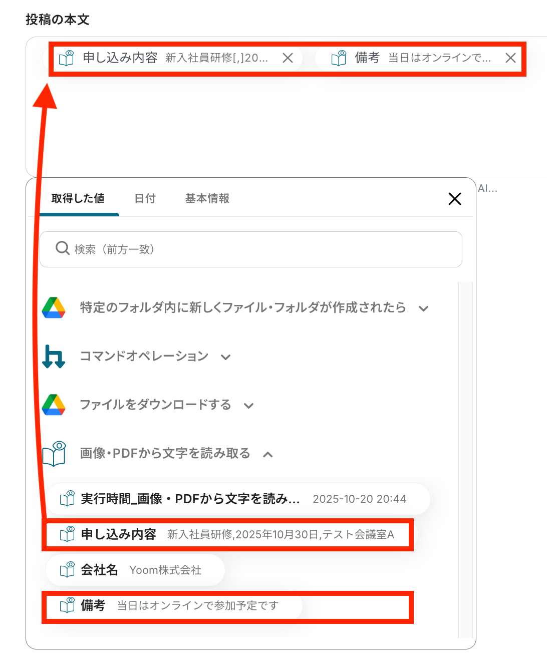 この連携は、OCRによる抽出処理を含むパターンで、手動でのテキスト化や投稿作業にかかる時間を削減したいときにおすすめです。