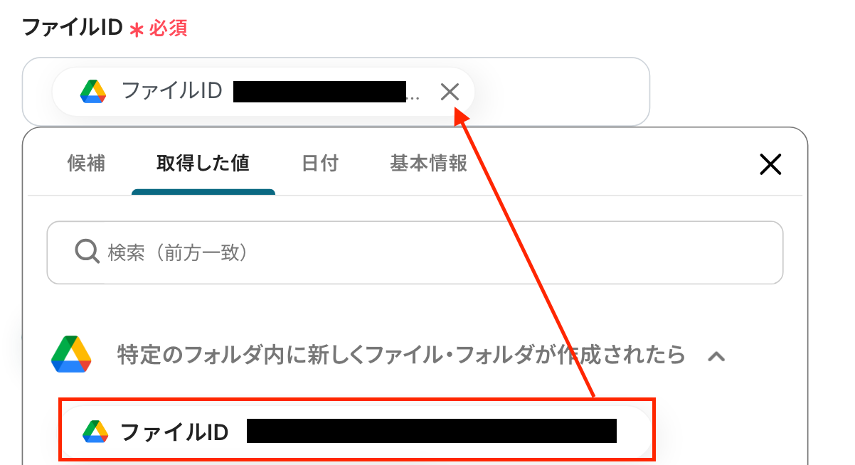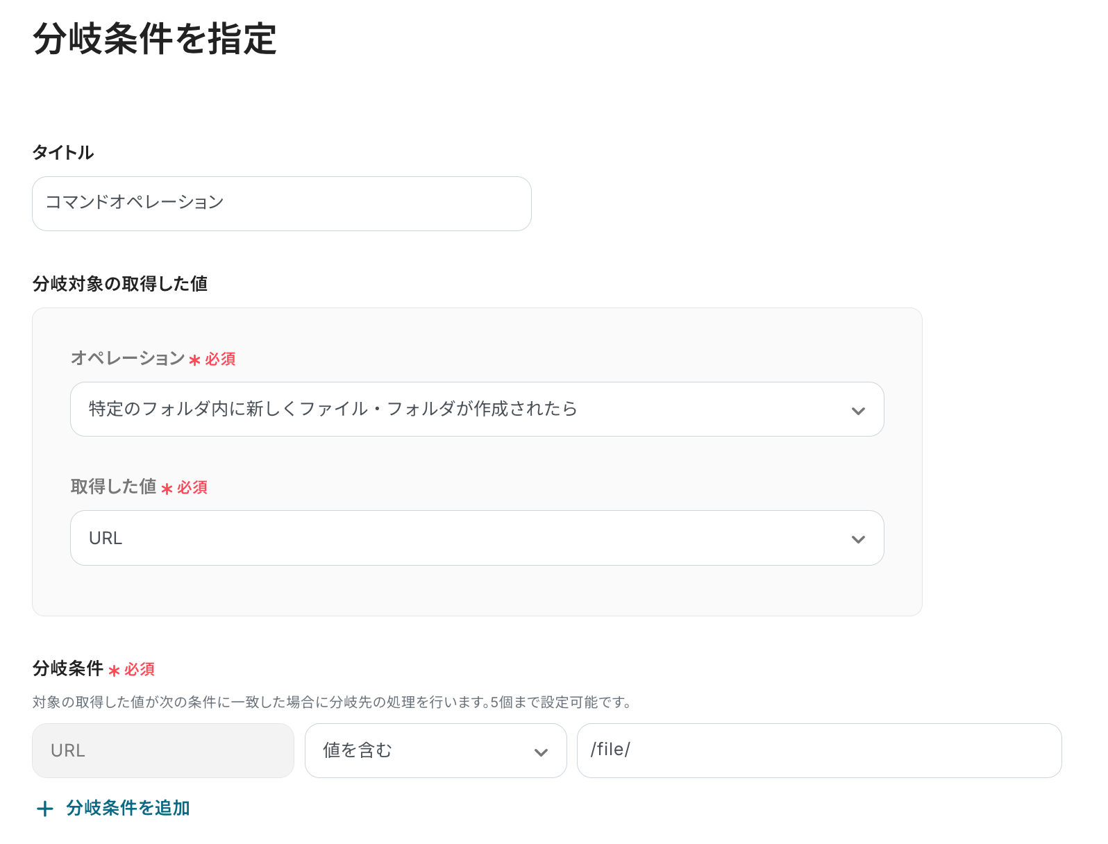 分岐設定では、オペレーションに「特定のフォルダ内に新しくファイル・フォルダが作成されたら」、取得した値に検知したい項目を設定します。