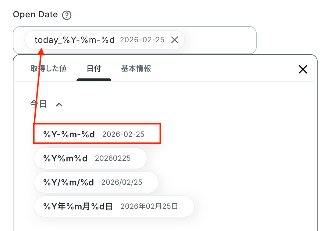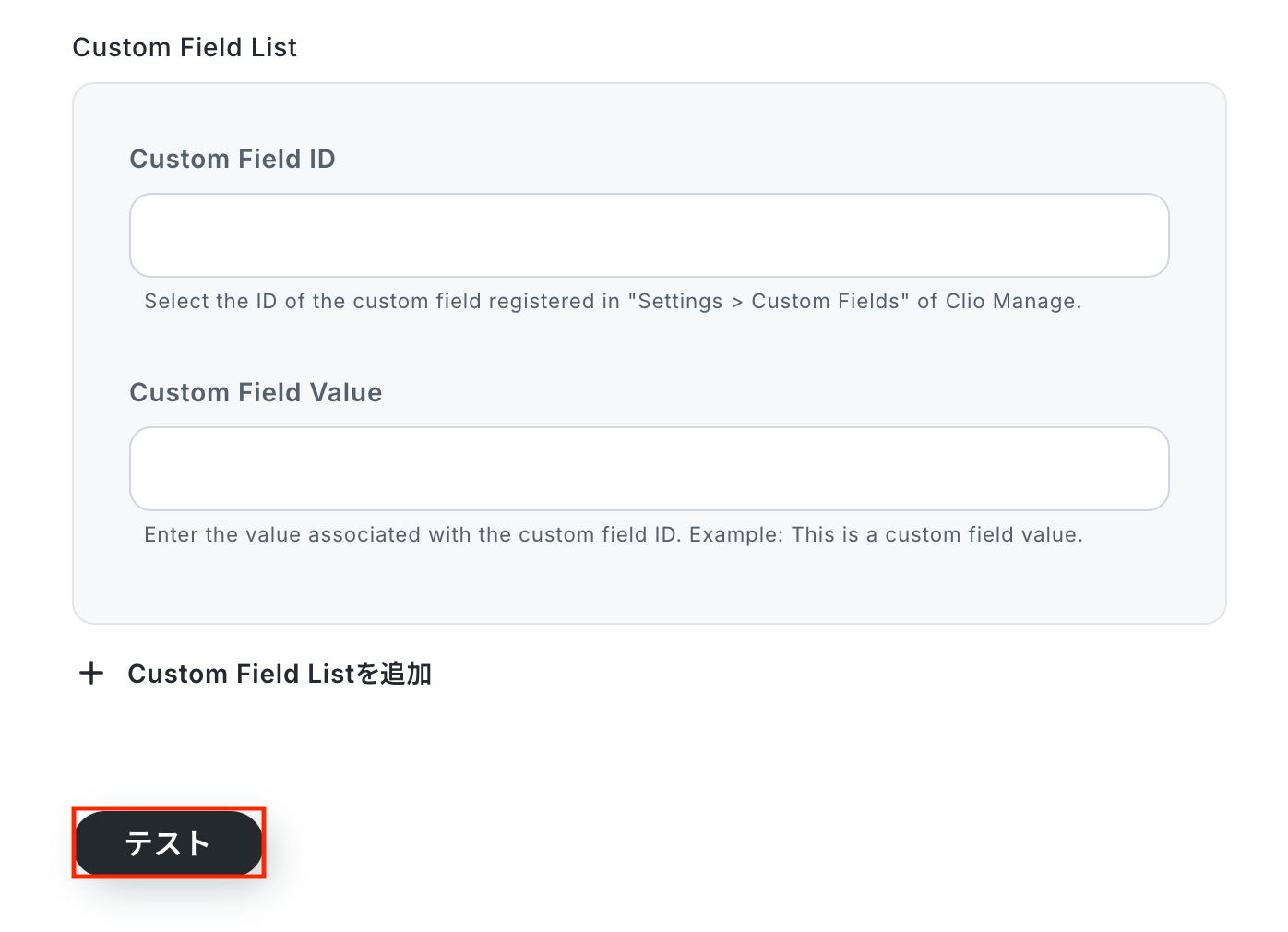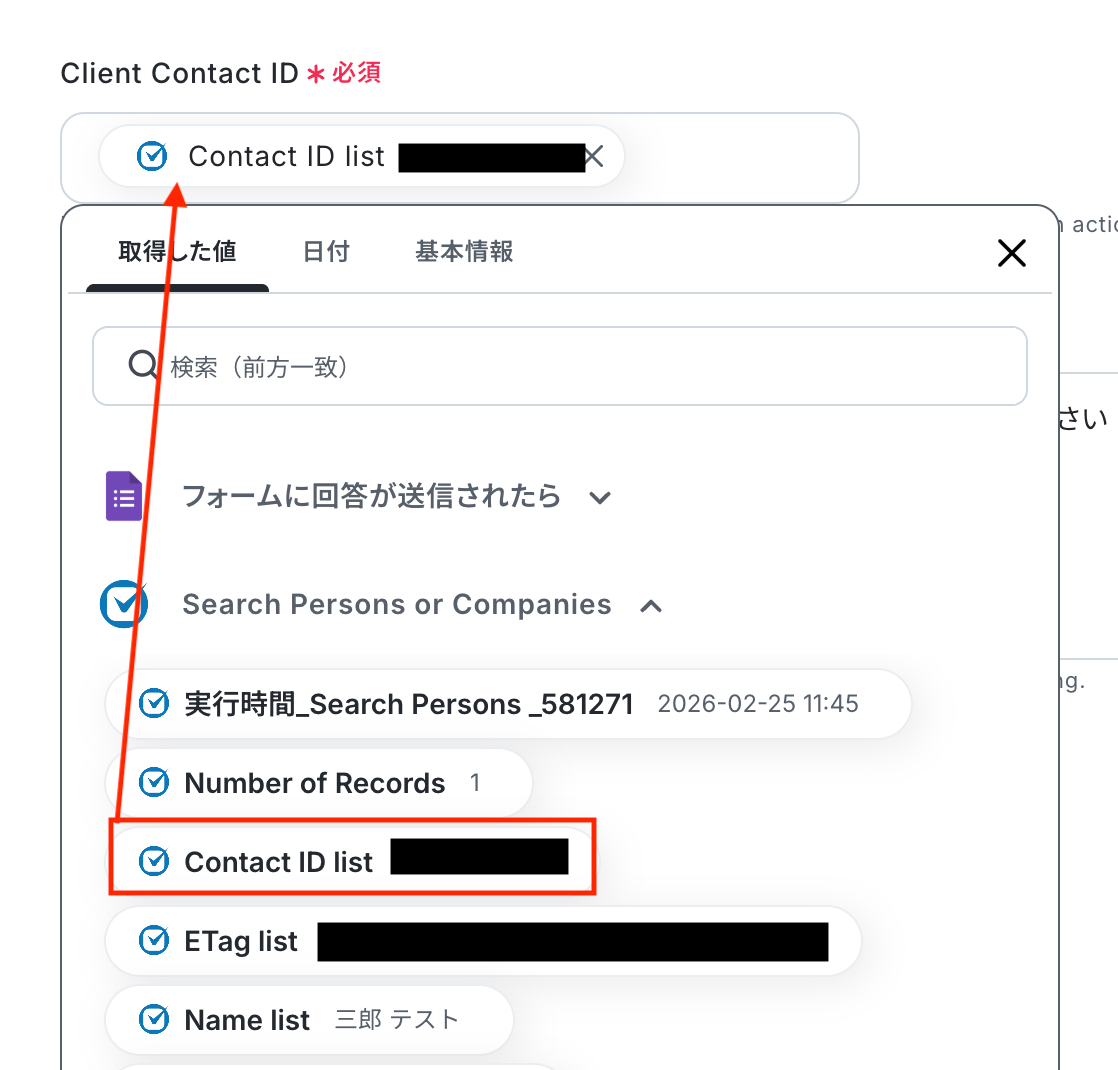 ※テキストを直接入力した部分やプルダウンは固定値とされるため、取得した値を活用せず設定を行うと毎回同じデータがClio Manageで検索されてしまうので注意が必要です。