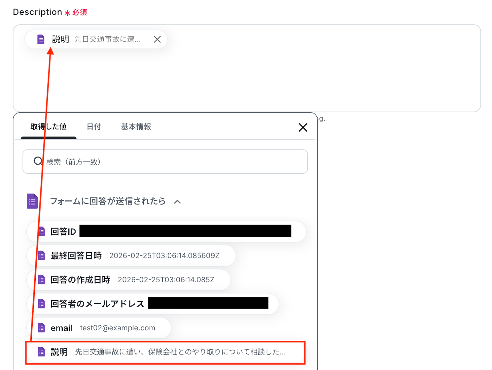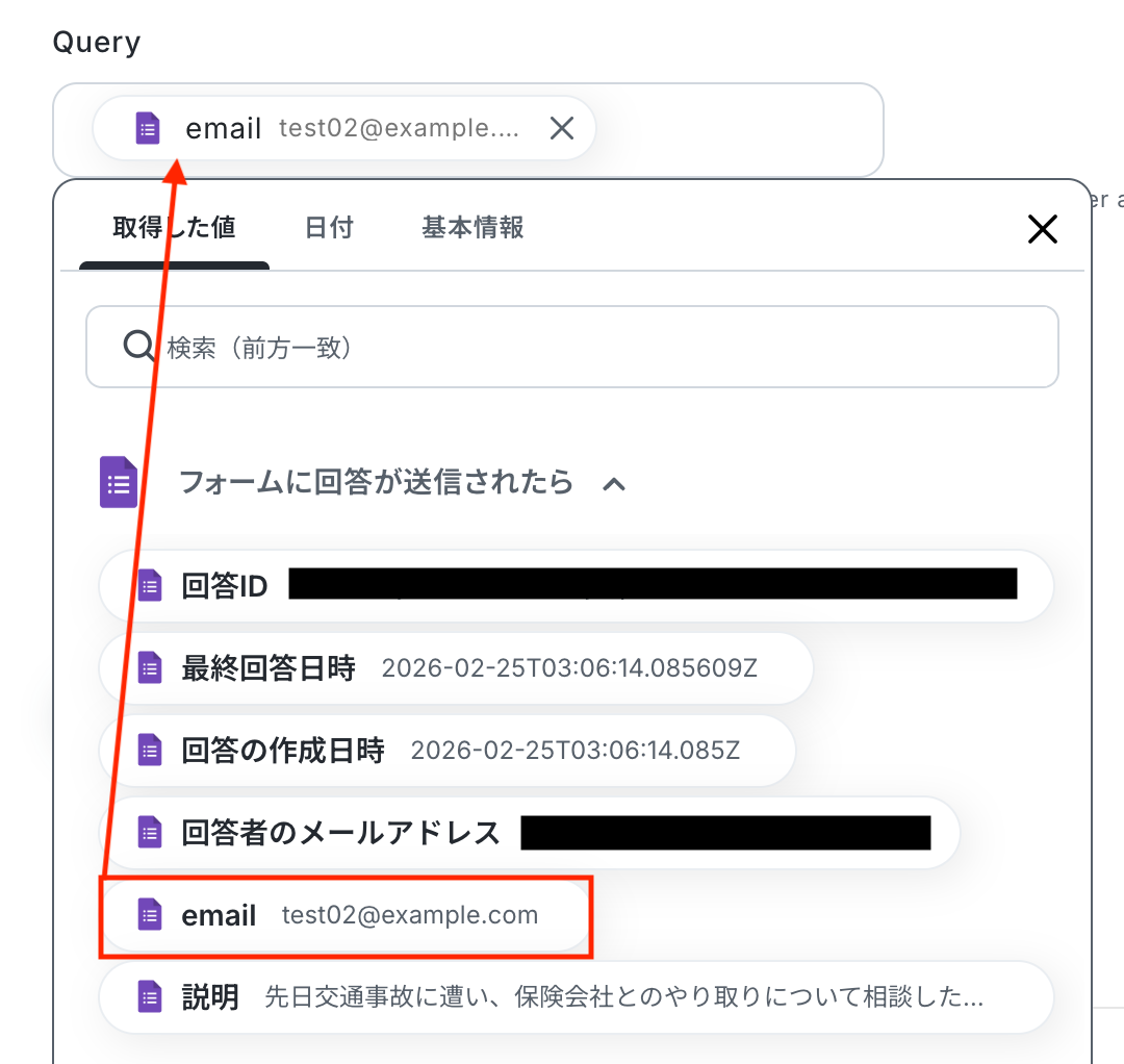 入力欄をクリックすると、前のステップでGoogleフォームから取得した値が表示されるので、選択して入力しましょう。