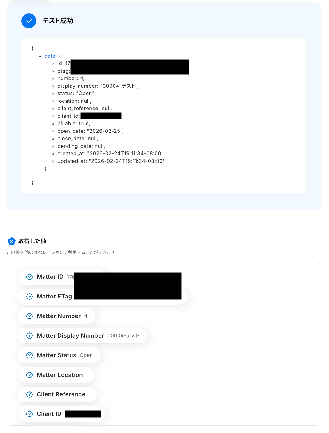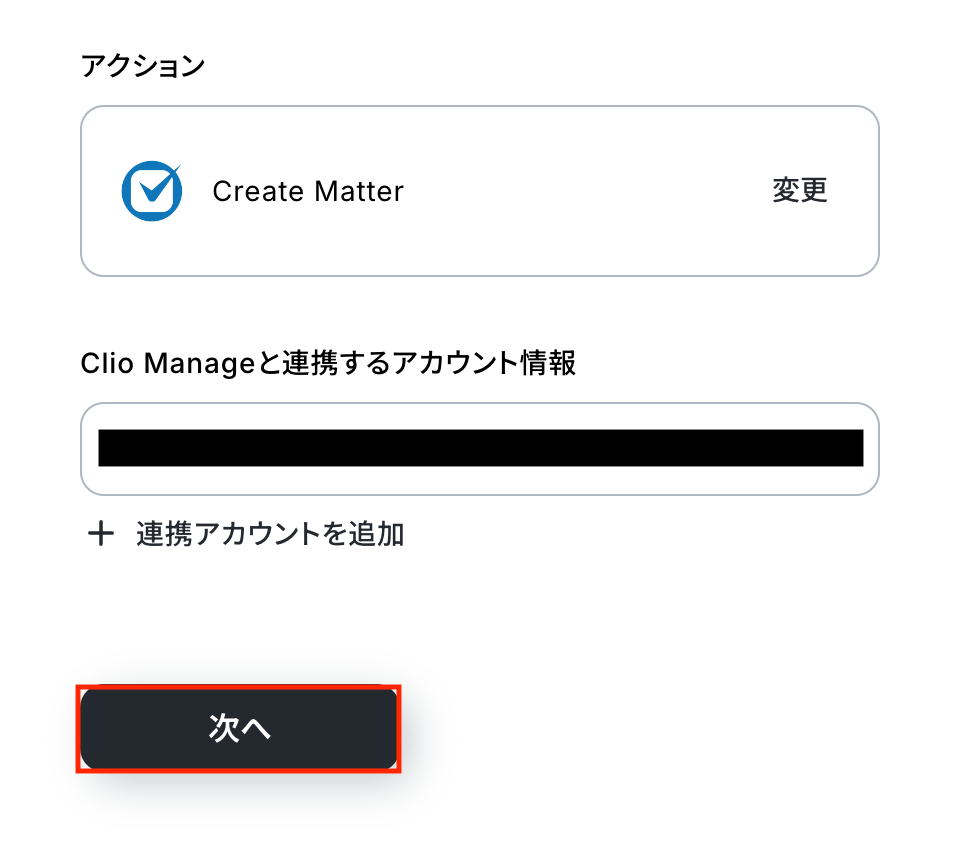 前のステップで取得した値を利用して、Clio ManageにMatter(案件)を作成しましょう。