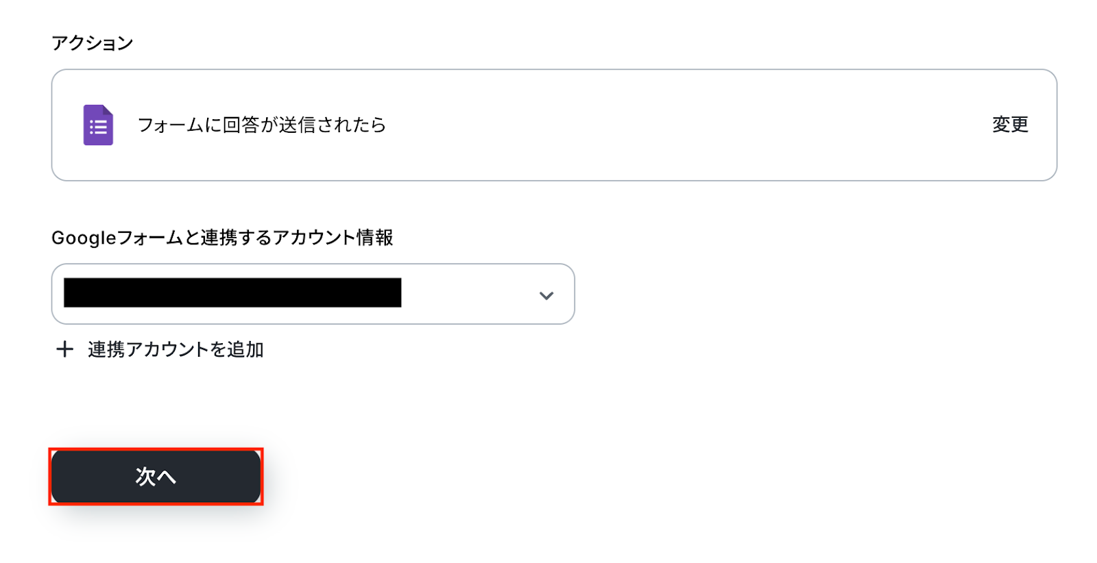 Googleフォームと連携するアカウント情報に問題がなければ、「次へ」をクリックします。
