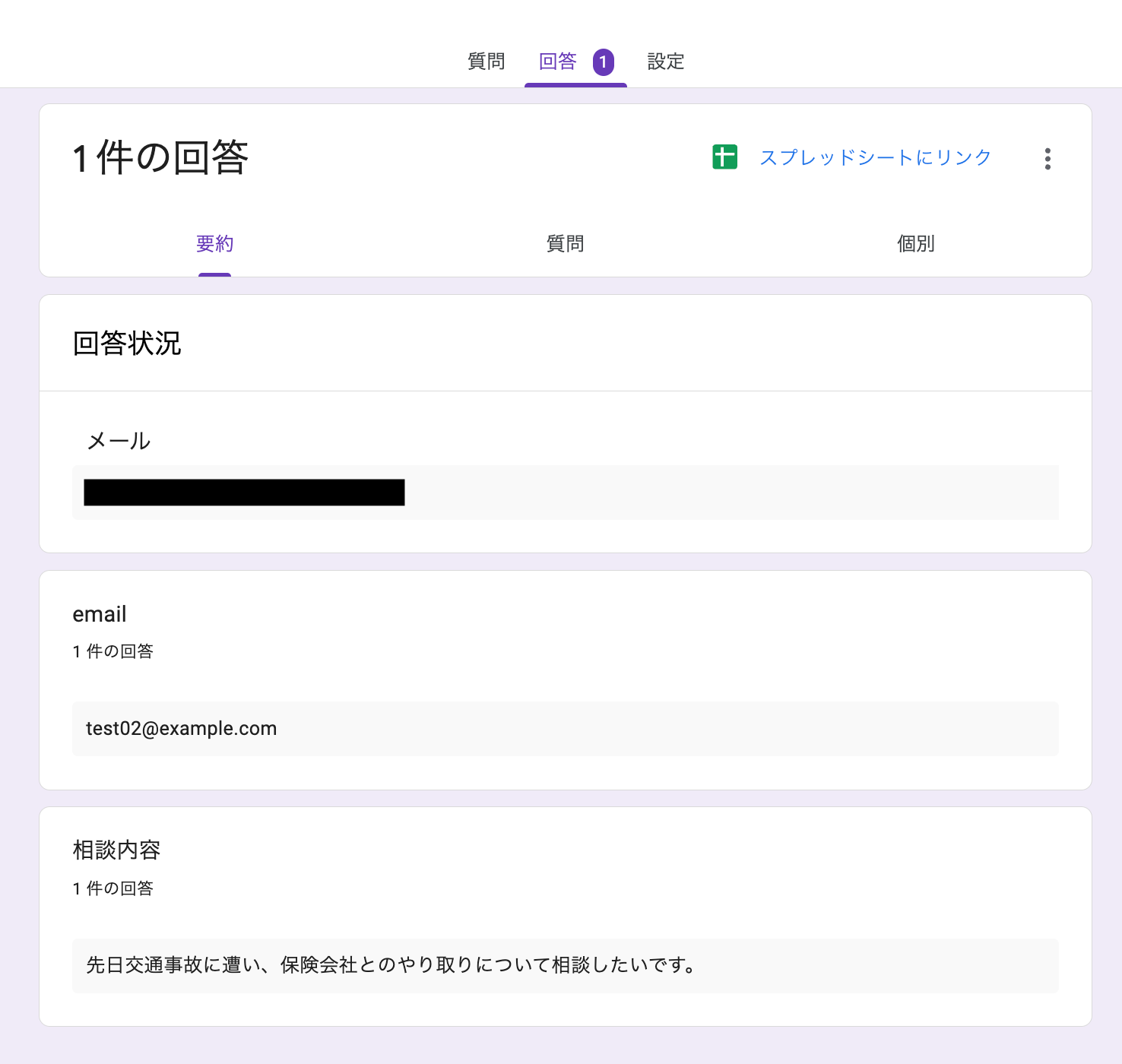 事前準備として、あらかじめGoogleフォームでテスト用に回答を送信しておきましょう。