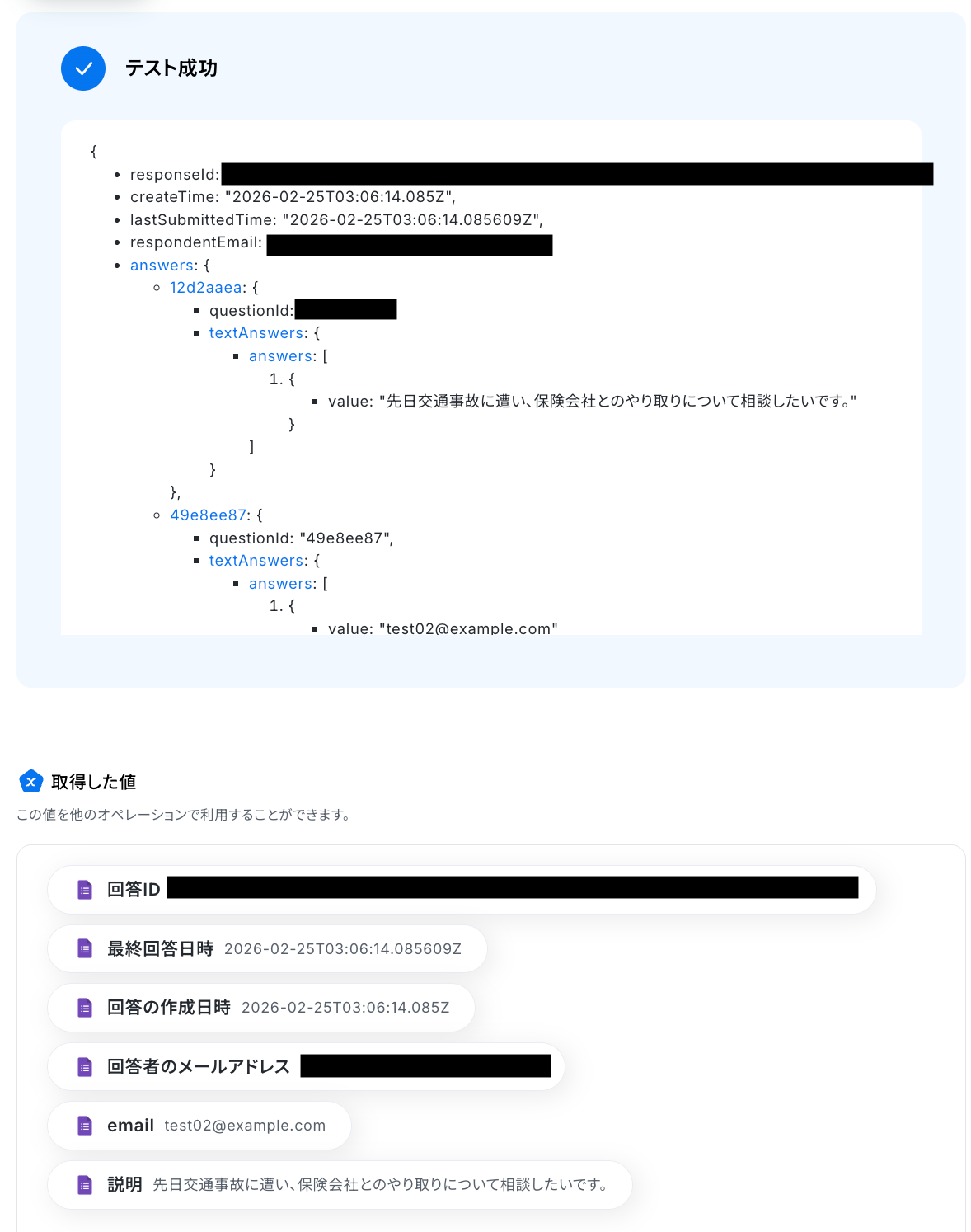 テストに成功すると、Googleフォームに送信された回答に関する情報が一覧で表示されます。