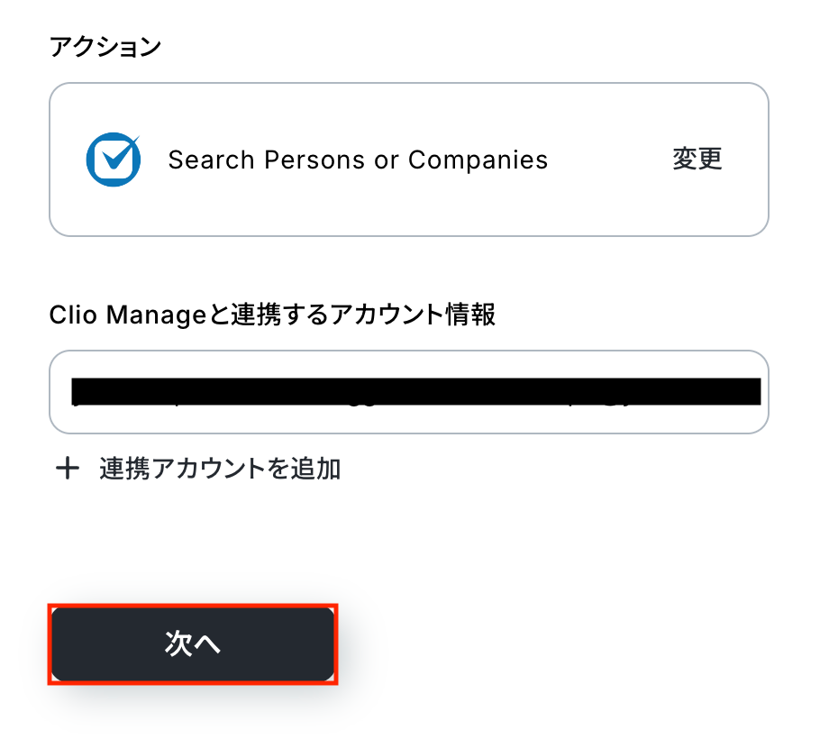 Clio Manageと連携するアカウント情報に問題がなければ、「次へ」をクリックします。