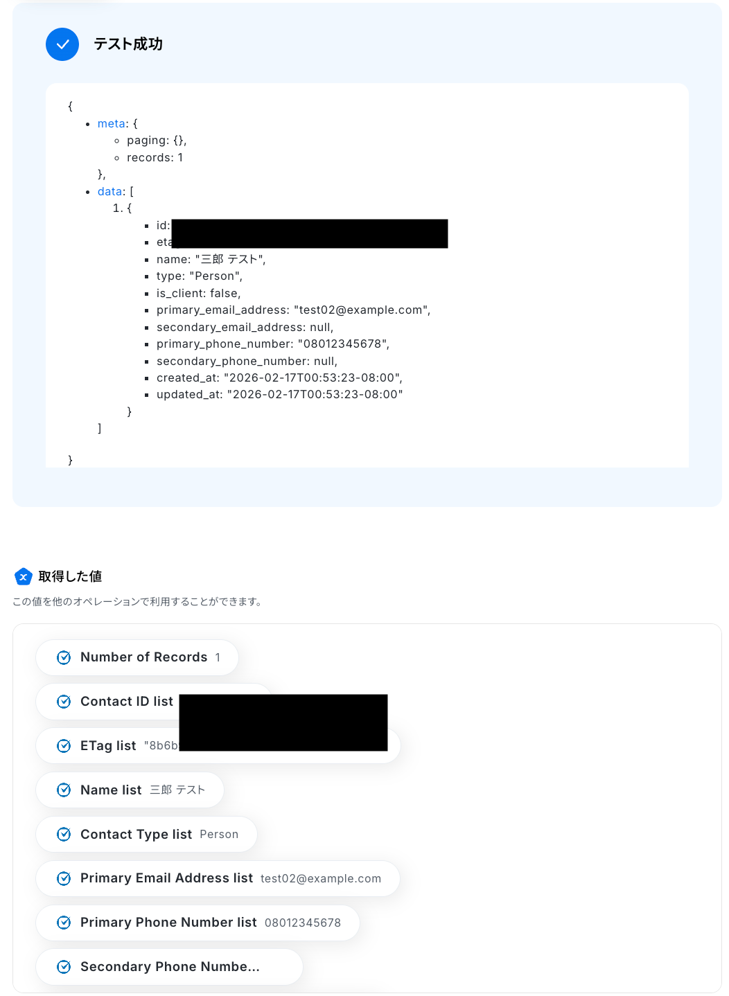 テストに成功すると、Clio Manageで検索された人物または企業の情報が画面上に表示されます。