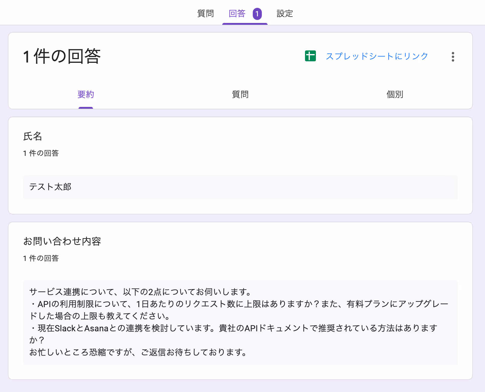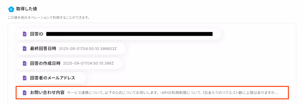 なお、デフォルトで取得した値は、仕様上「回答ID」「最終回答日時」「回答の作成日時」「回答者のメールアドレス」のみとなっています。