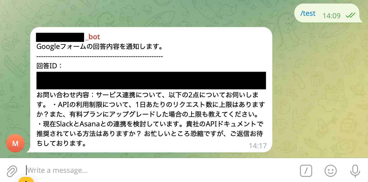 テストを実行し、TelegramにGoogleフォームの回答内容が届いていれば、設定完了です。