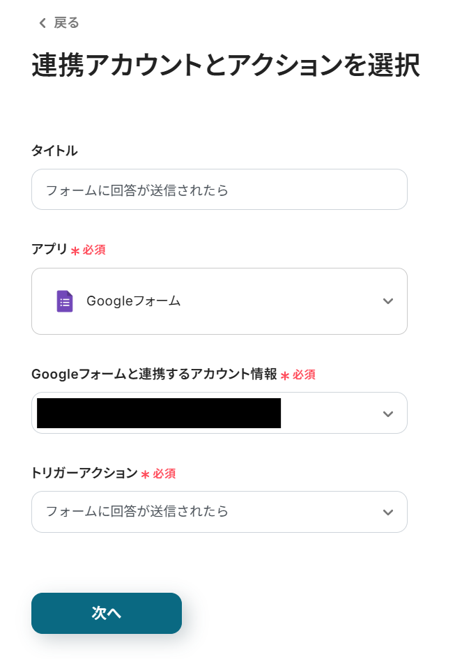 - Googleフォームのトリガー設定では、連携したい任意のフォームを指定してください。