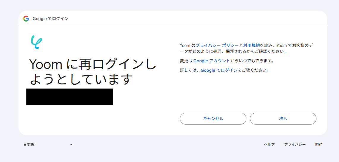 選択したGoogleアカウントでログイン確認画面が表示されるので、「次へ」をクリックします。