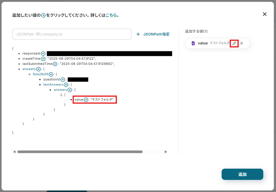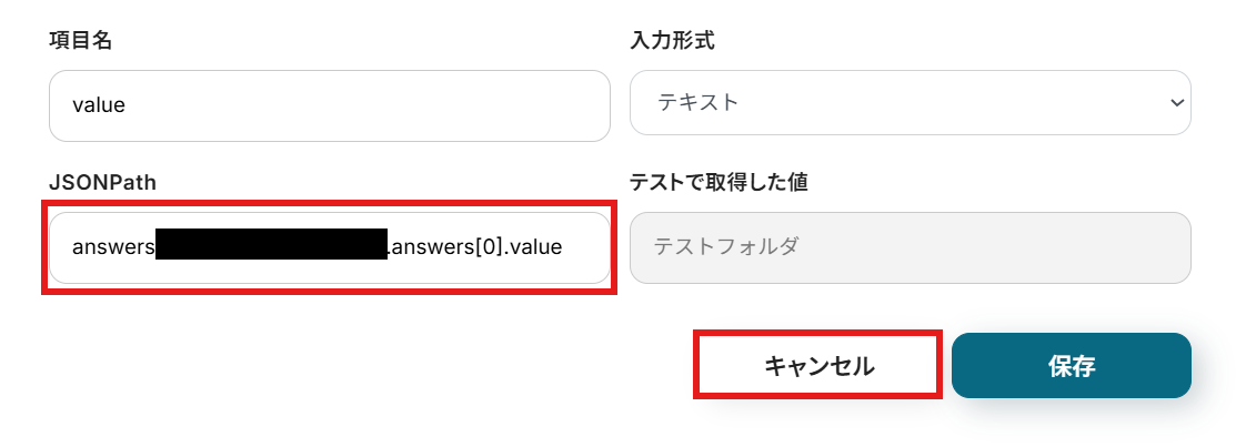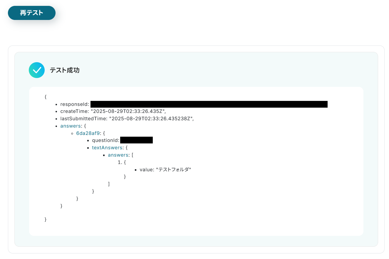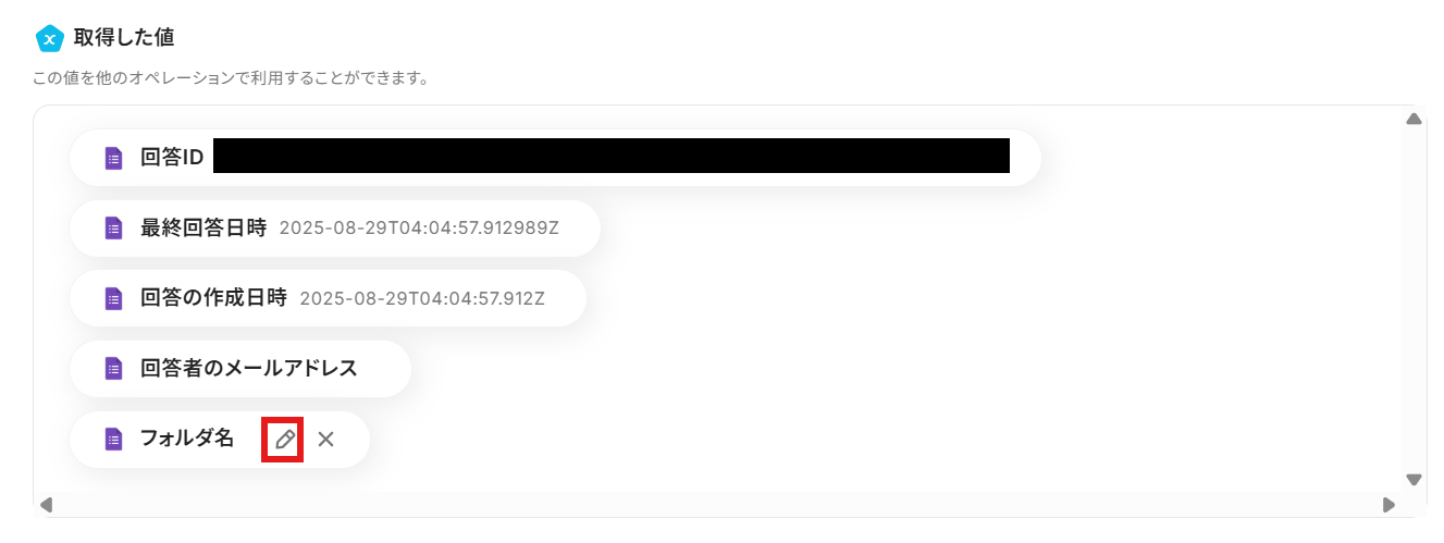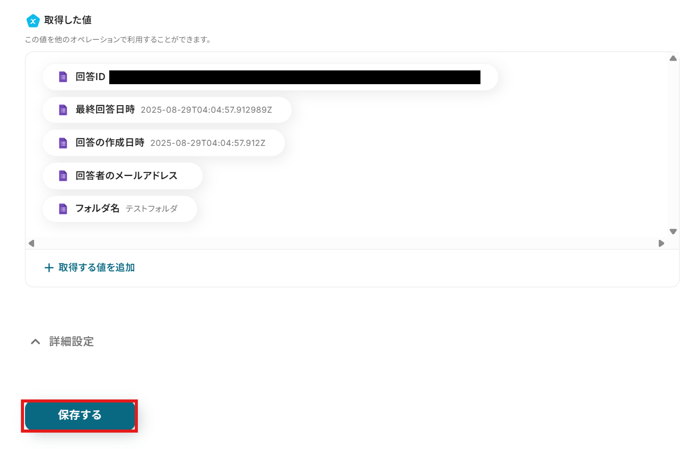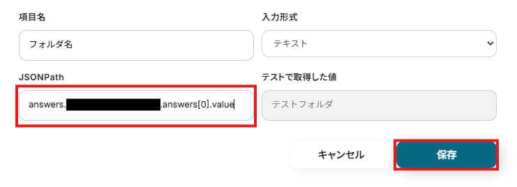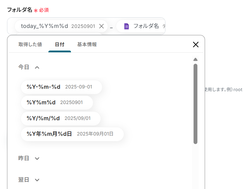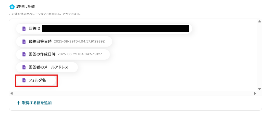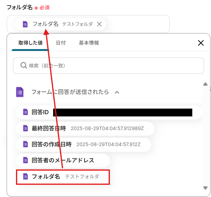 - 「フォルダの作成」では、Googleフォームで取得した回答内容を変数として埋め込むことで、回答に応じた動的なフォルダ名を設定できます。